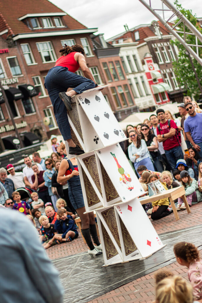 Hartendame Laat je meevoeren in een zinderende straatshow vol spanning en humor. Een betoverend tango-duet aan de trapeze, vlijmscherpe messen die rakelings voorbij zoeven, balancerend op breekbare wijnflessen en een levensgroot kaartenhuis dat wiebelt op het randje van instorten. Tussendoor duikt steeds weer een mysterieuze kaartentruc op, als een magische rode draad door de show. Hartendame is een voorstelling die ieder op het puntje van de stoel laat balanceren!