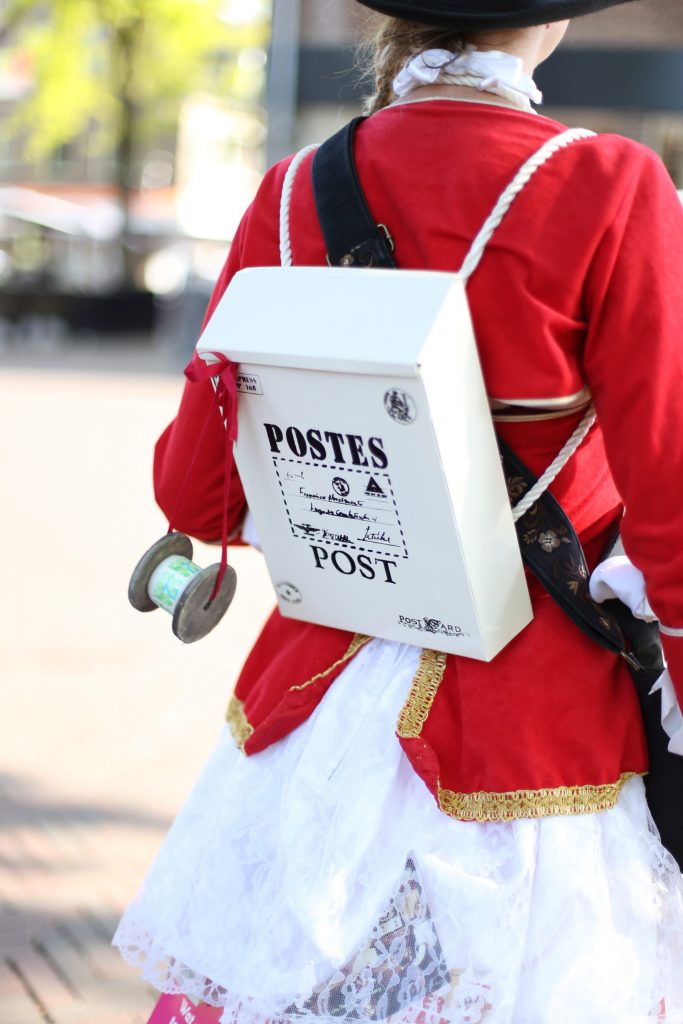 Stuur een echte kaart aan je geliefde. Valentina’s rok bestaat uit heel veel kaarten met mooie teksten. Daar mag je er 1 uitzoeken. Je kaartje kun je schrijven op haar schrijftafeltje dat ze op haar buik draagt. Uit haar hoed tovert ze een postzegel en je kunt het kaartje posten in de brievenbus op haar rug.